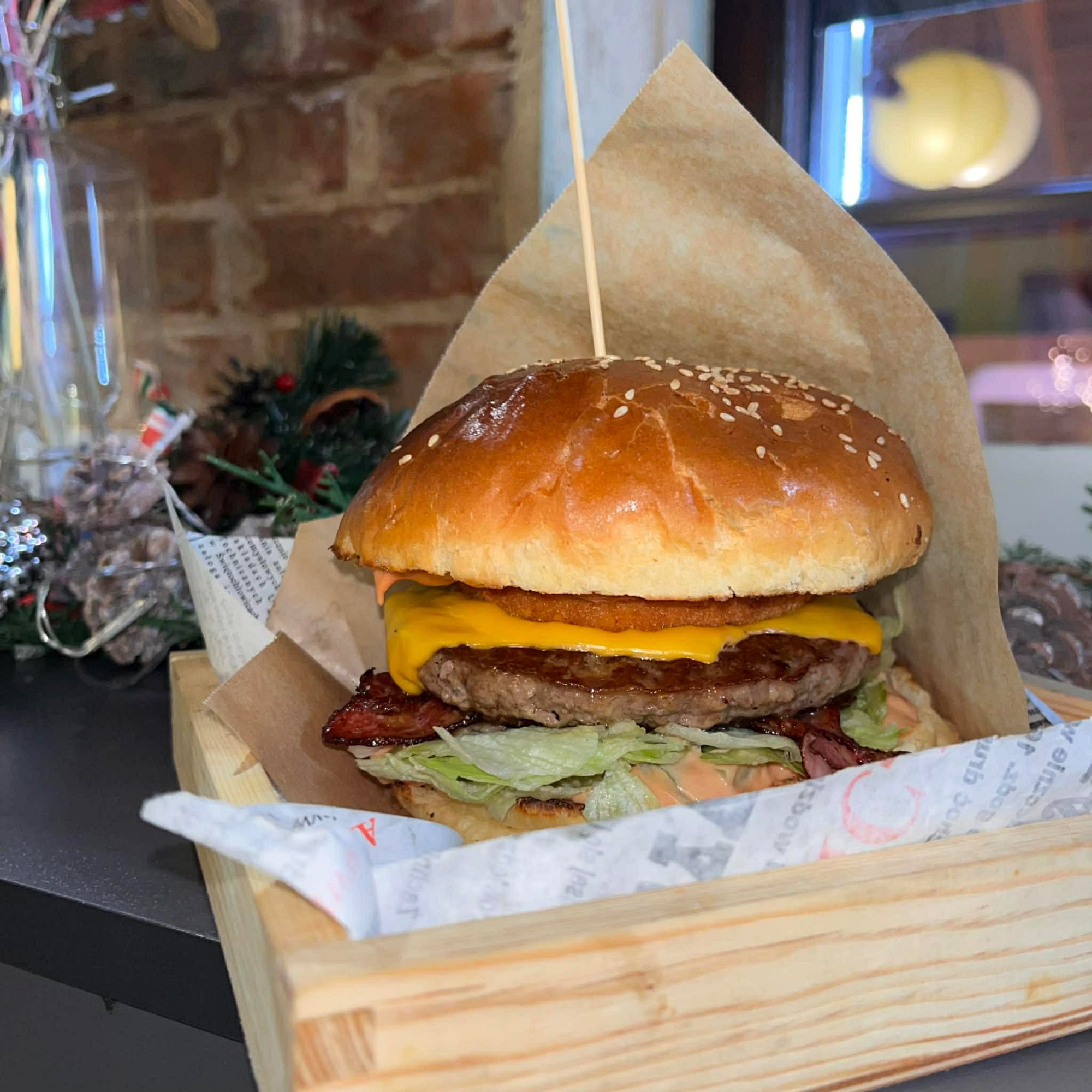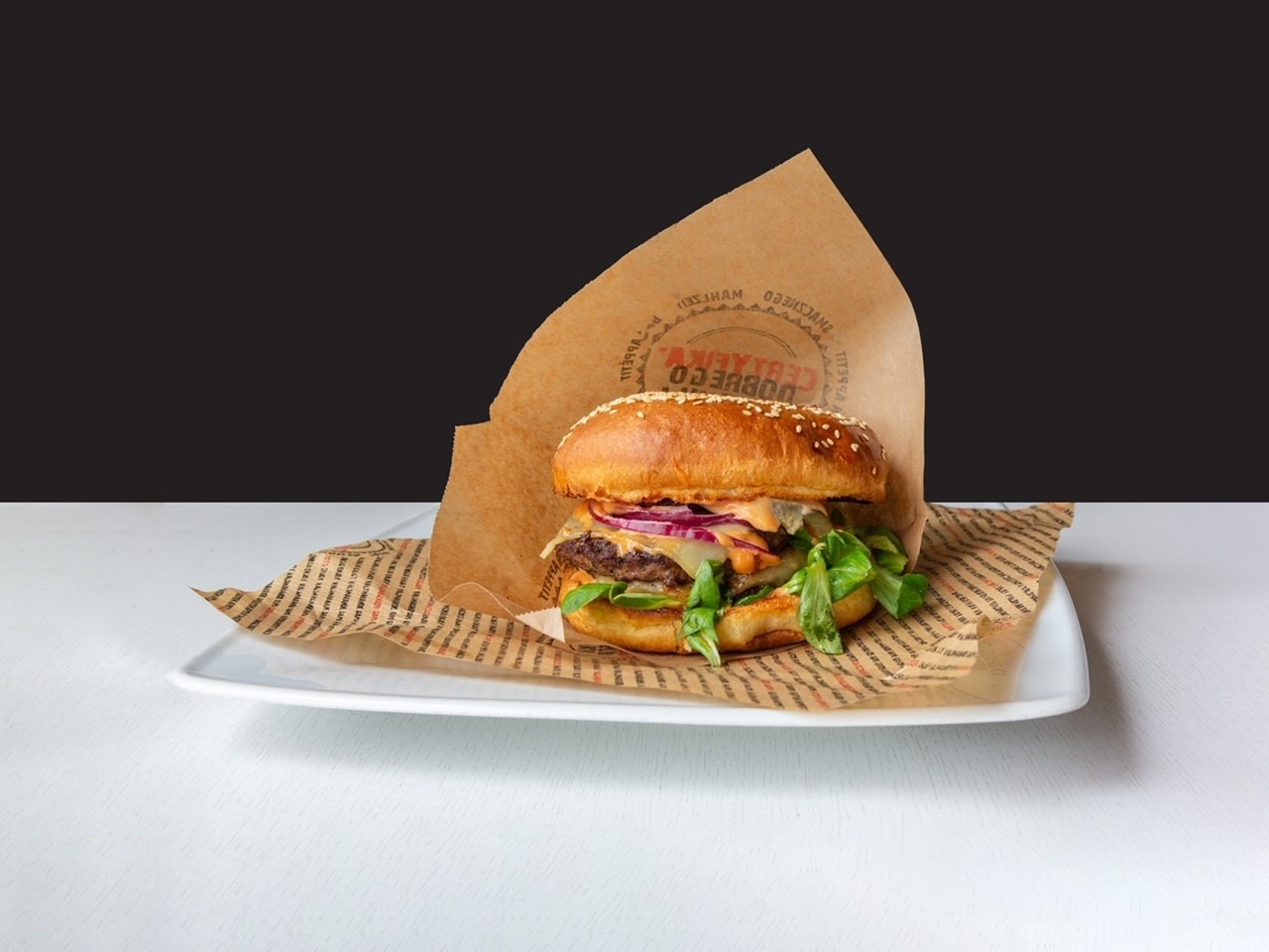 grillowana pierś z kurczaka, bułka, sos, sałata, cebula czerwona, ogórek kiszony -